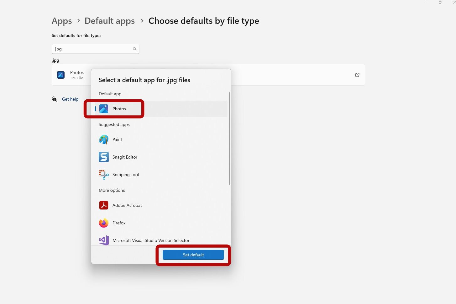 8. In this example, for the JPG file extension you will choose either Photos or Paint as the default app. Then click on the Set Default button.