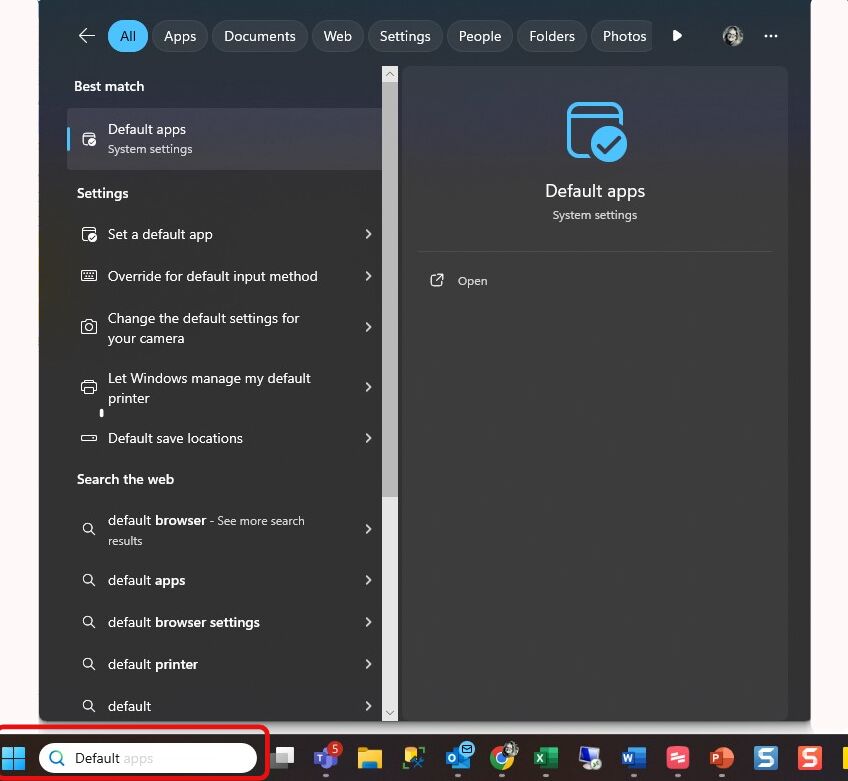 1. Navigate to the search bar from your Windows desktop. Then type in Default Apps and select that option from the list of suggestions.