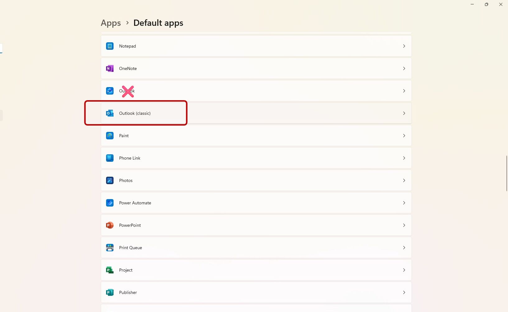 2. Scroll down to the Outlook application in the list. Then click on the Outlook Classic option.
