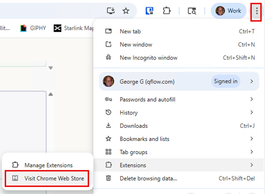 Open a Google Chrome browser and click the 3 dots located in the upper right next to your profile. Expand the “Extensions” option and select “Visit Chrome Web Store”.