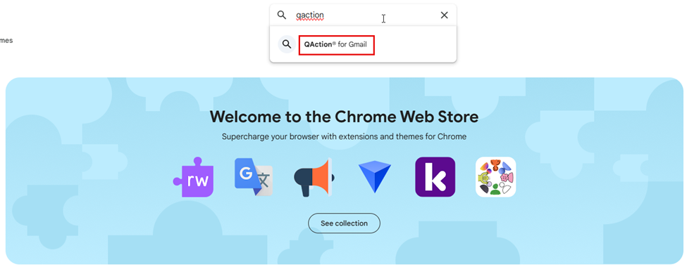 The Chrome Web Store will open in a new tab. In the search field enter “QAction”. Select “QAction for Gmail” from the suggested extensions.