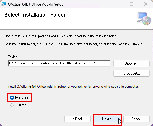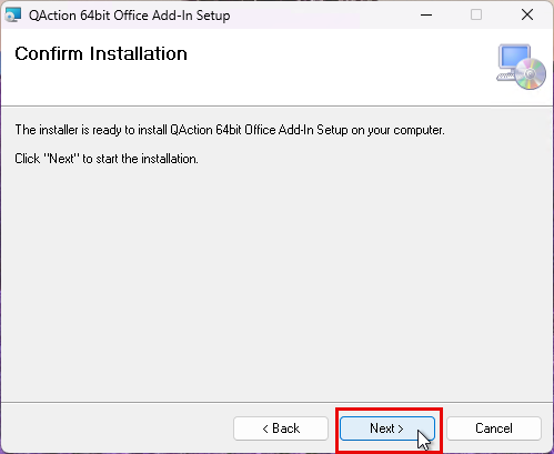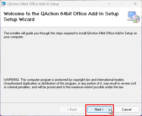 When the “QAction 64bit Office Add-in Setup” window appears, click “Next”.