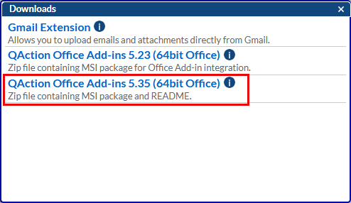 When the download window appears, select the latest version of “QAction Office Add-ins”. In this example: “QAction Office Add-ins 5.35 (64bit Office)”.