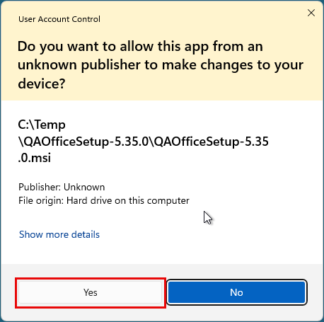 A Windows User Access Control window may display a warning message asking if you want to allow an app from an unknown publisher. Click “Yes”.