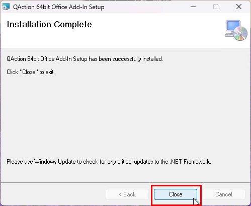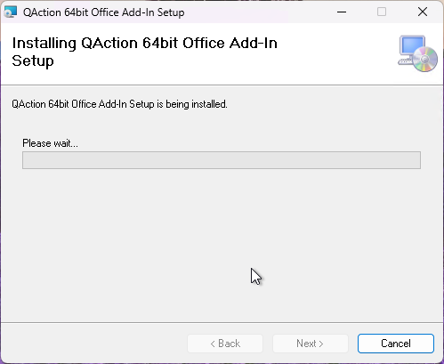 The “Installing QAction 64bit Office Add-in Setup” will be displayed showing the status of the installation.