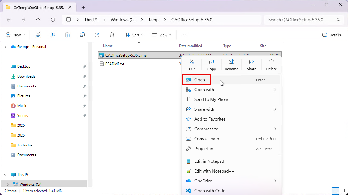 After the files are extracted, a File Explorer window will be displayed with the extracted files. Right click on the .MSI file and select “Open”.