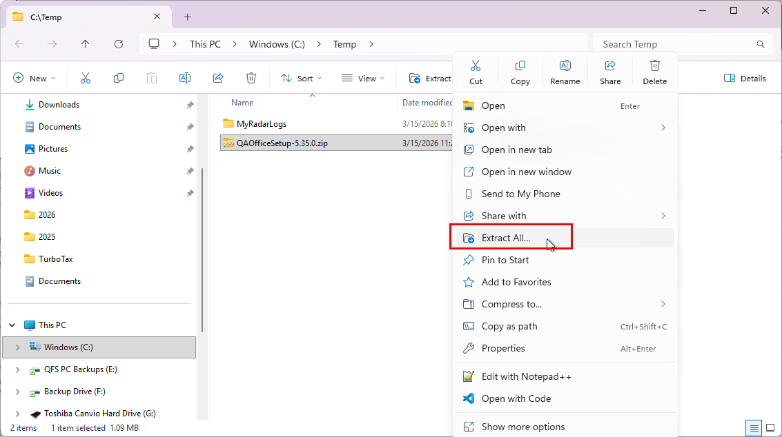 Open a File Explorer window and navigate to the location where the file was downloaded. Right mouse click on the .ZIP file and select “Extract All…”