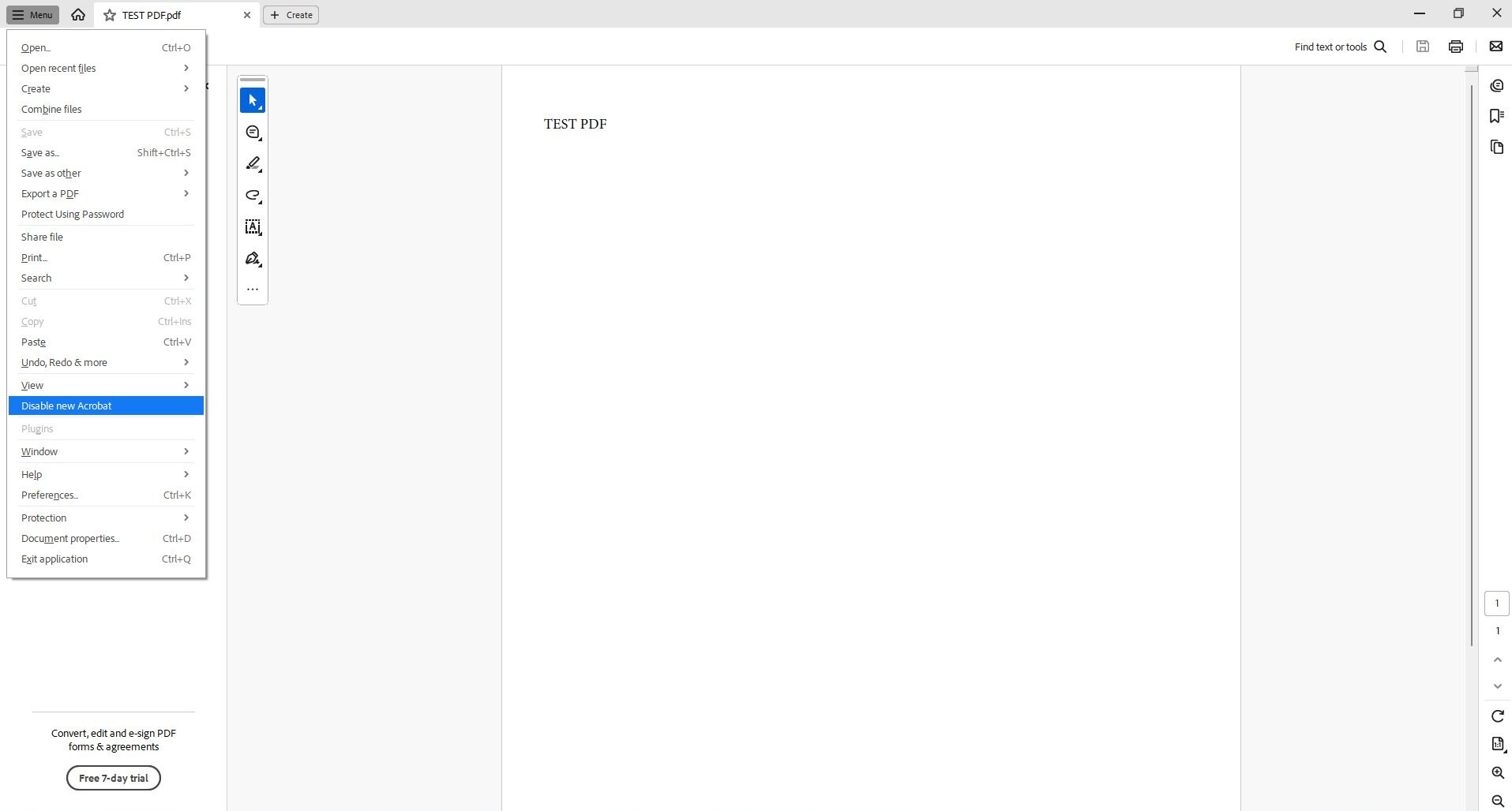 2. If you have the updated version of Adobe, the interface will look like this. Click on the Menu option in the top left of the screen. Then select the option Disable new Acrobat