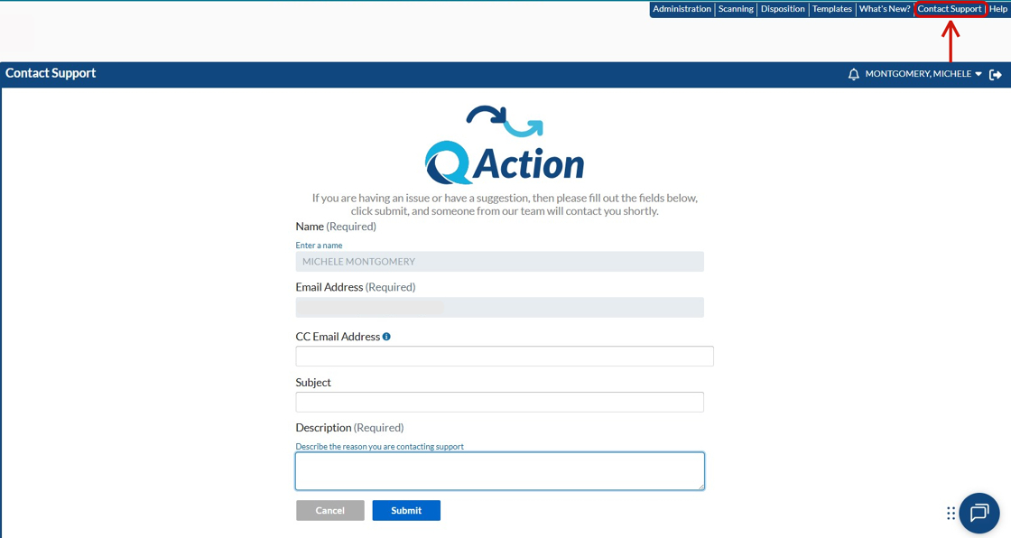 Click on the Contact Support tab in the upper right corner to submit a support request.